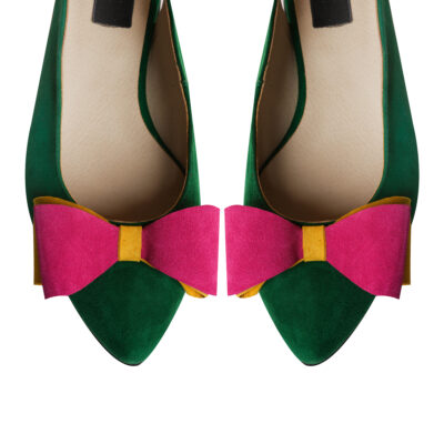 Modelul Trio Verde este o explozie de prospețime și stil, creat special pentru femeia care dorește să combine eleganța clasică a balerinilor cu un spirit ludic și modern. Realizați manual din piele naturală întoarsă de un verde smarald profund, acești balerini ies în evidență prin detaliul central: o fundă spectaculoasă ce îmbină armonios nuanțe de roz fuchsia și galben solar.